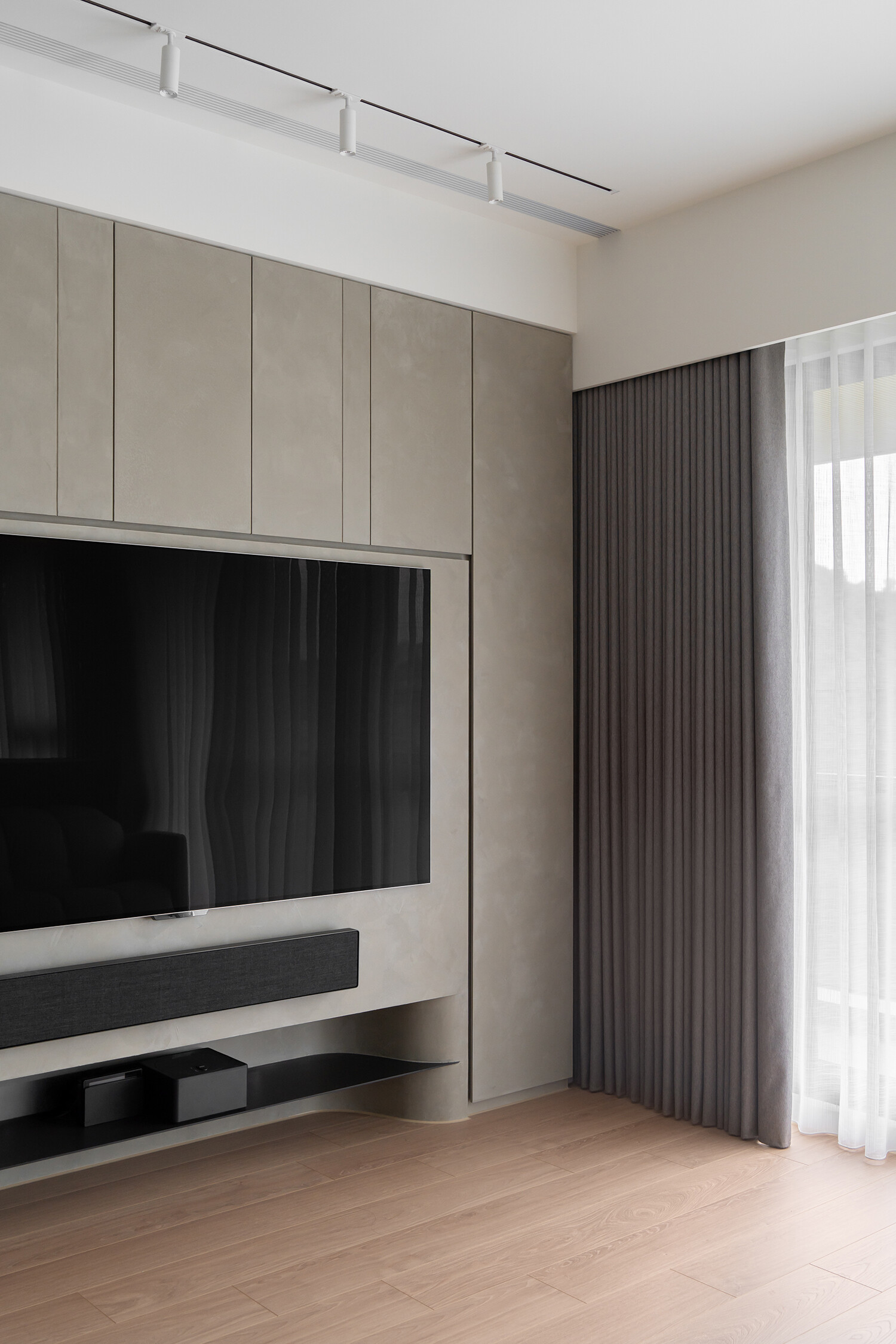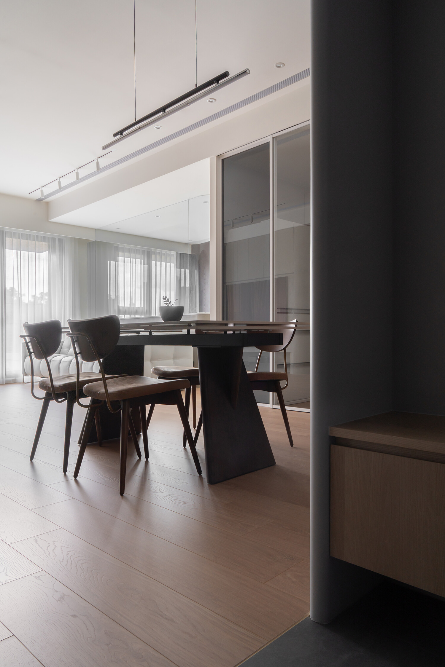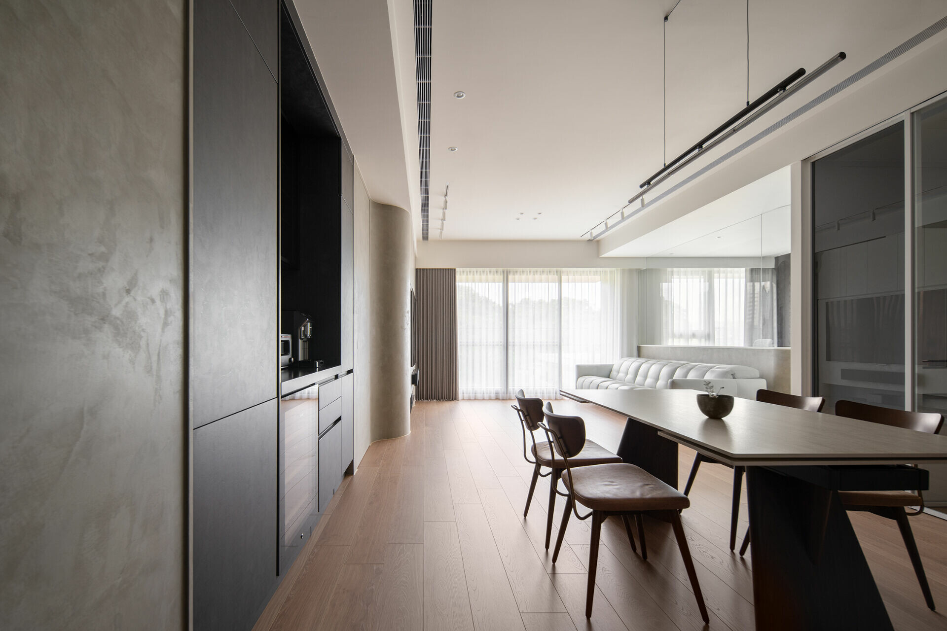 大面落地窗將山景引入室內,光影穿透薄紗簾幕,灑落於木質地坪,為冷冽的黑灰白增添溫潤。