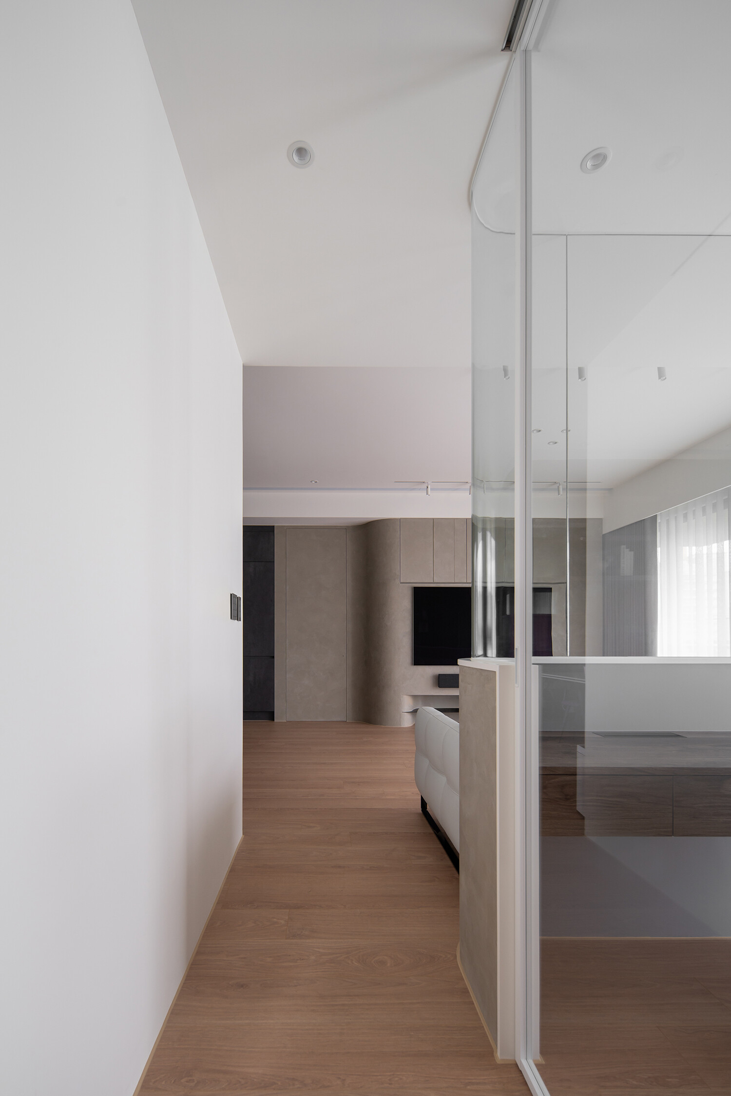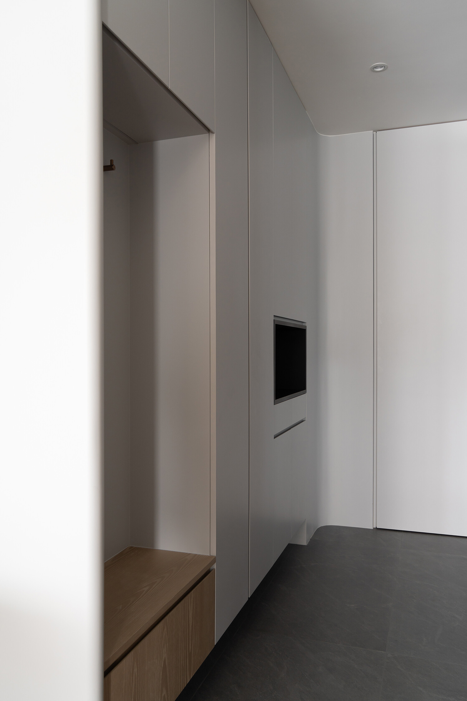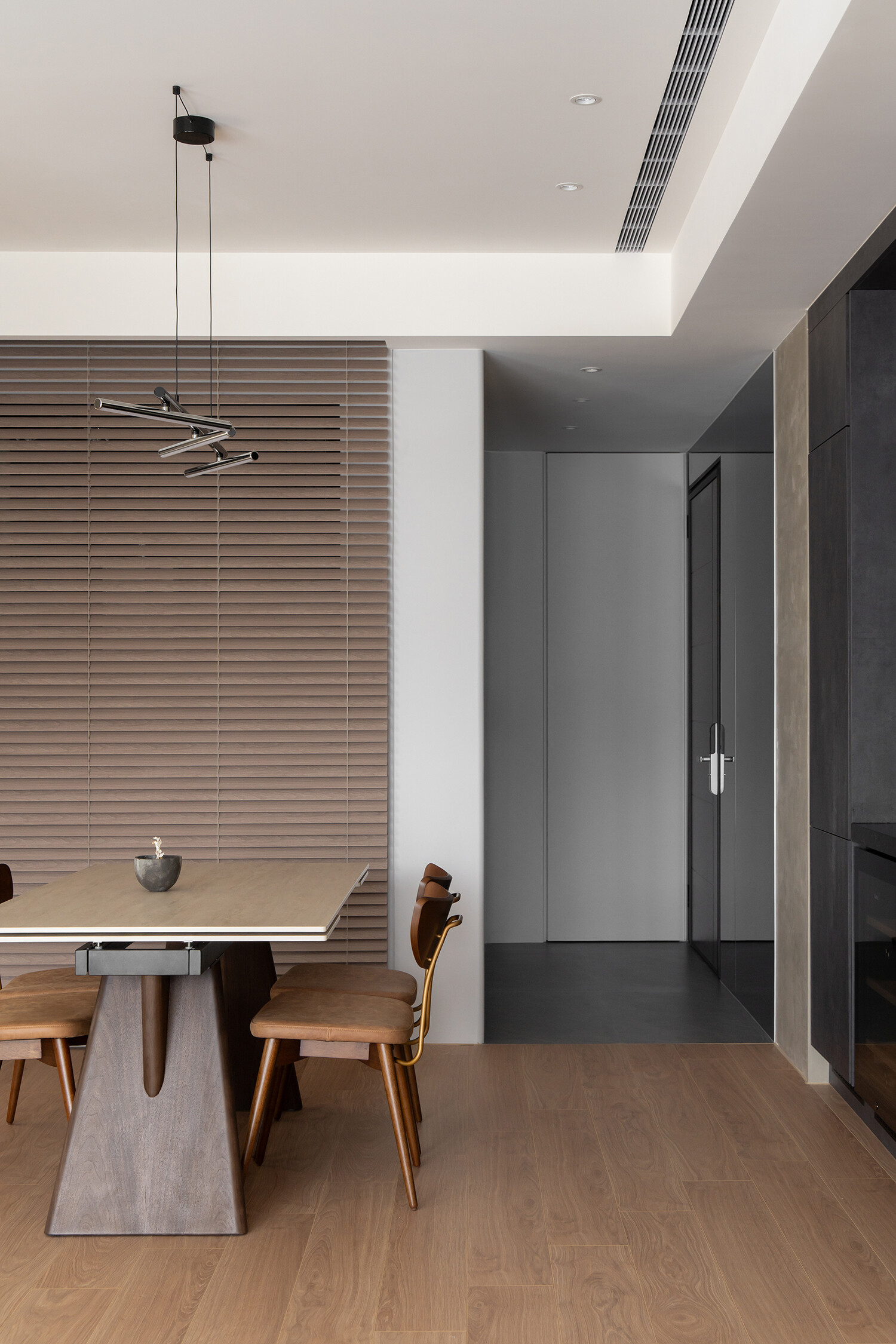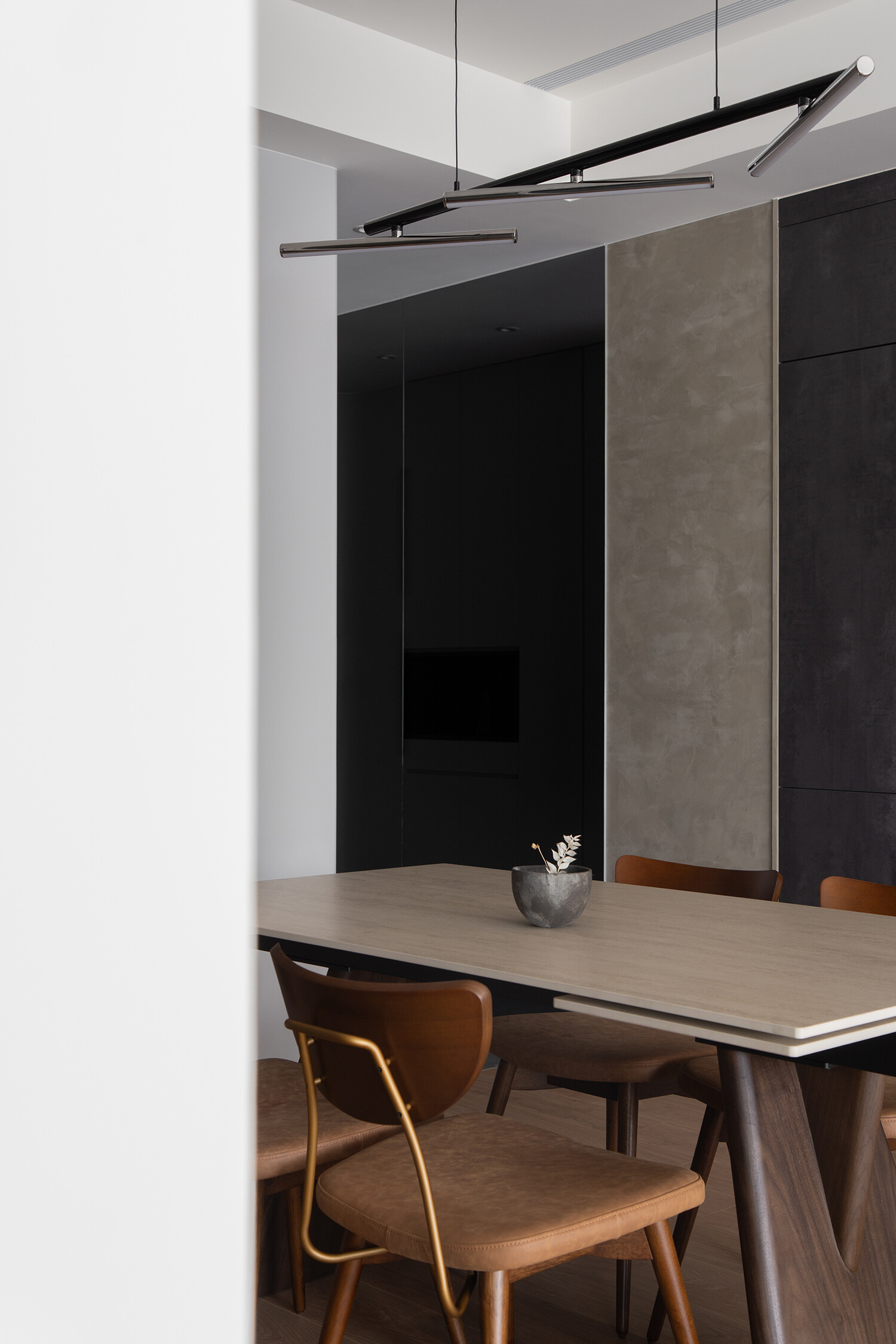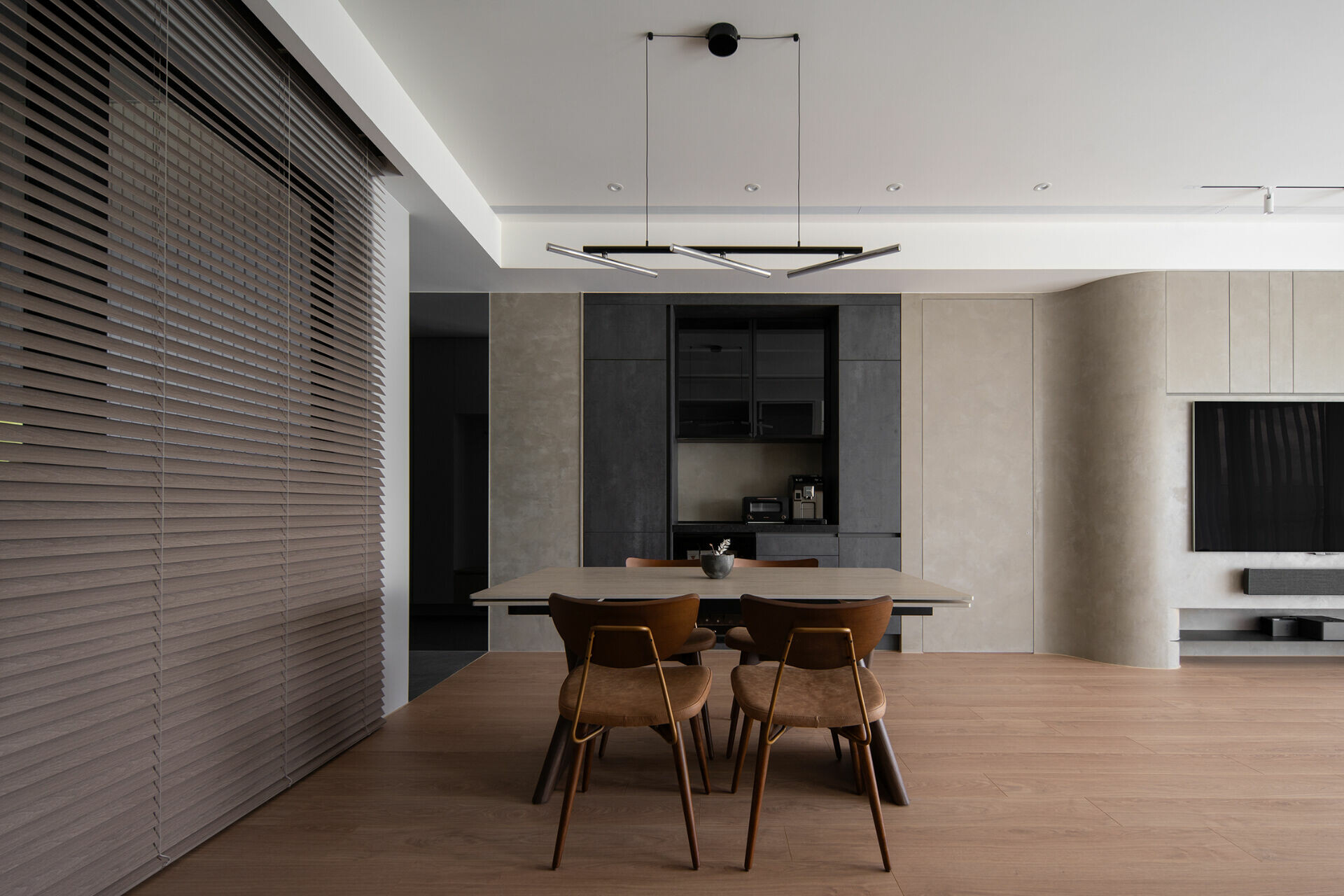 黑、灰、白為基調,勾勒俐落框架,弧形邊界如山巒般柔和。
