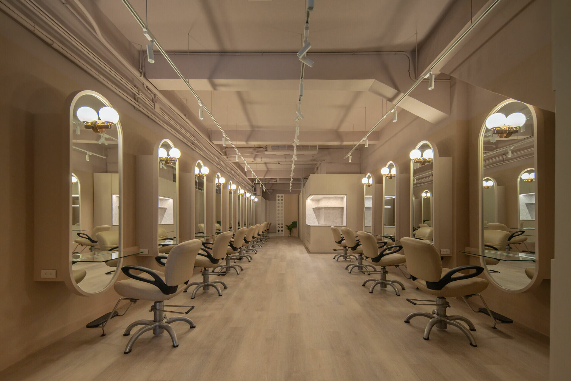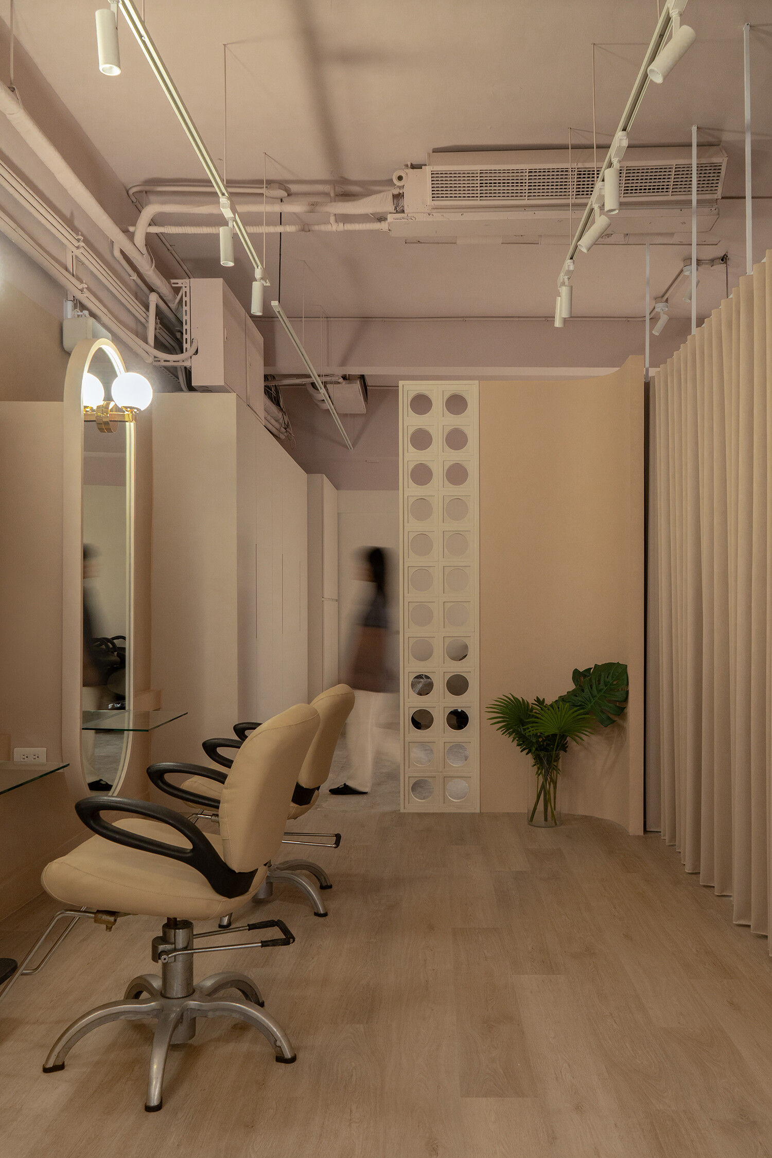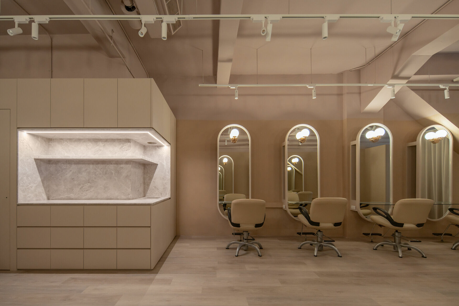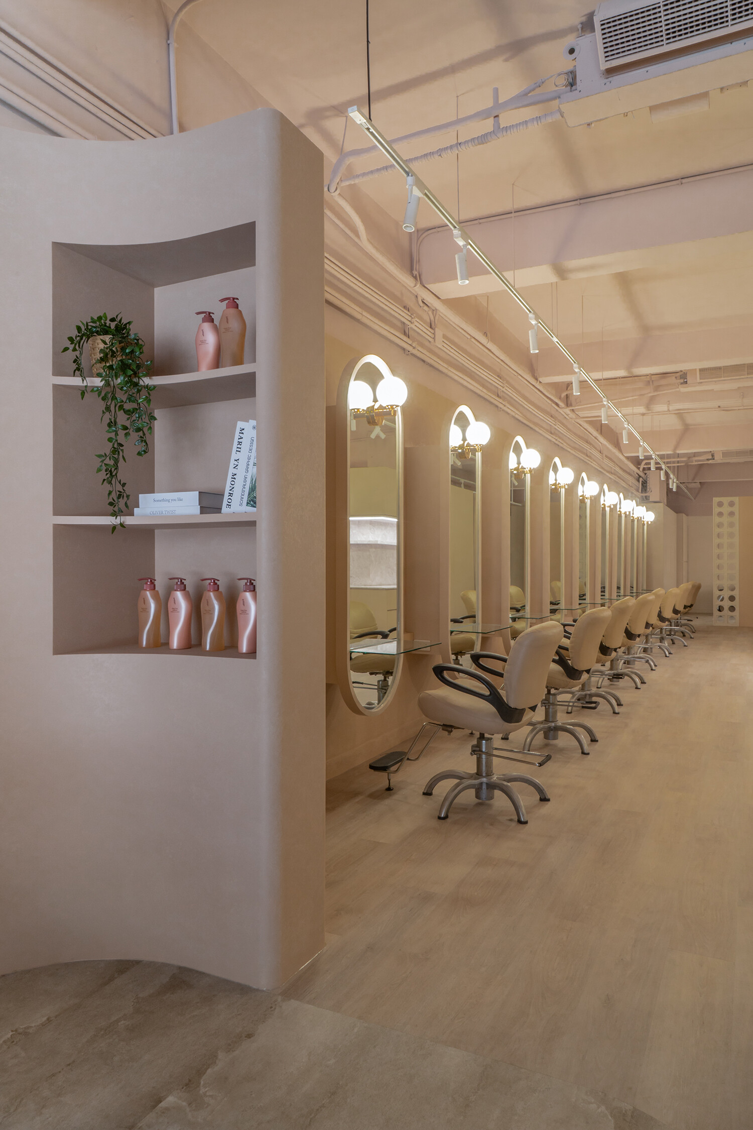 以柔霧塗料與弧形線條,從接待區延伸至剪髮與洗髮空間,圓弧鏡面、倒角桌面、造型壁燈如光般流動、圍塑專屬的靜謐與節奏。