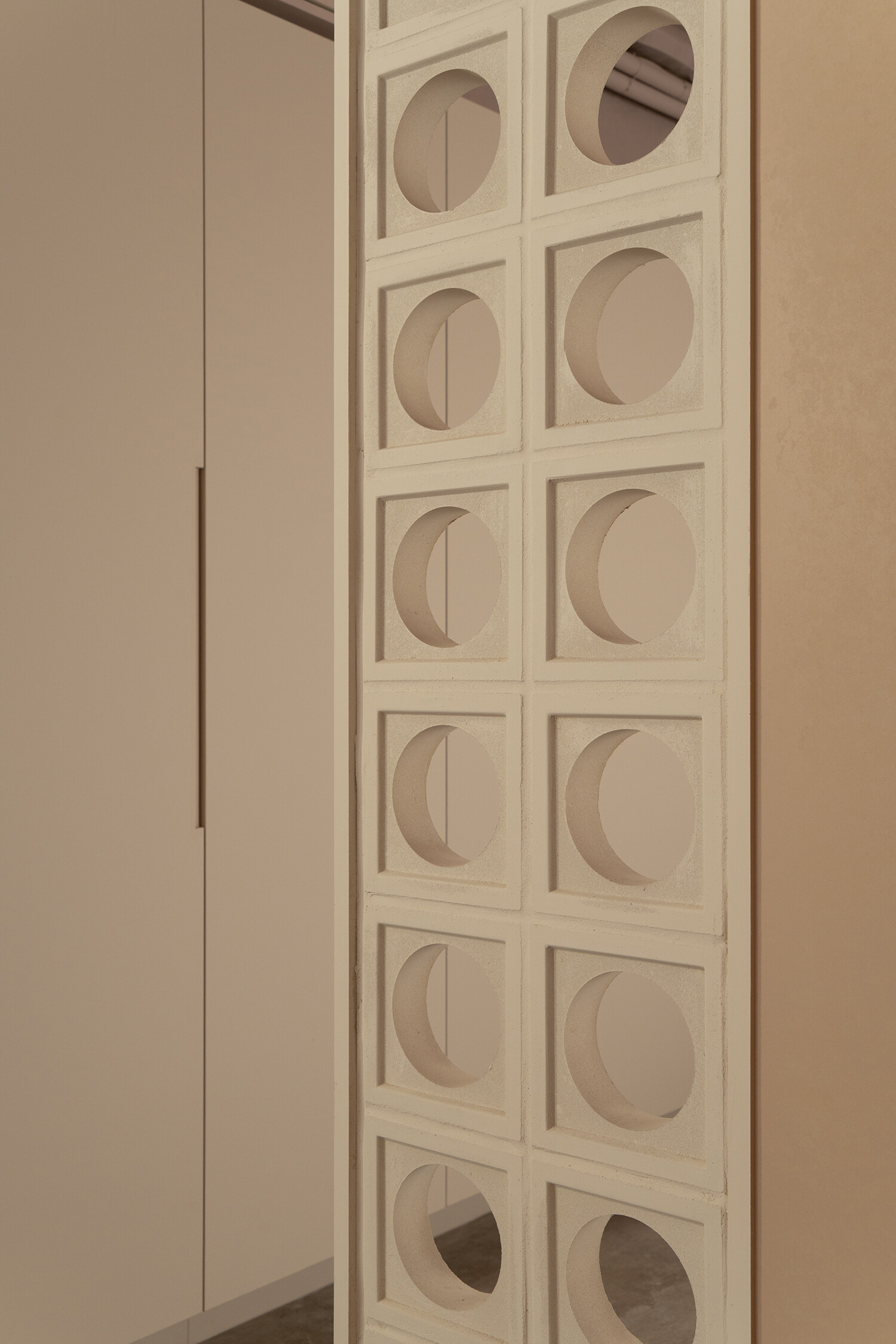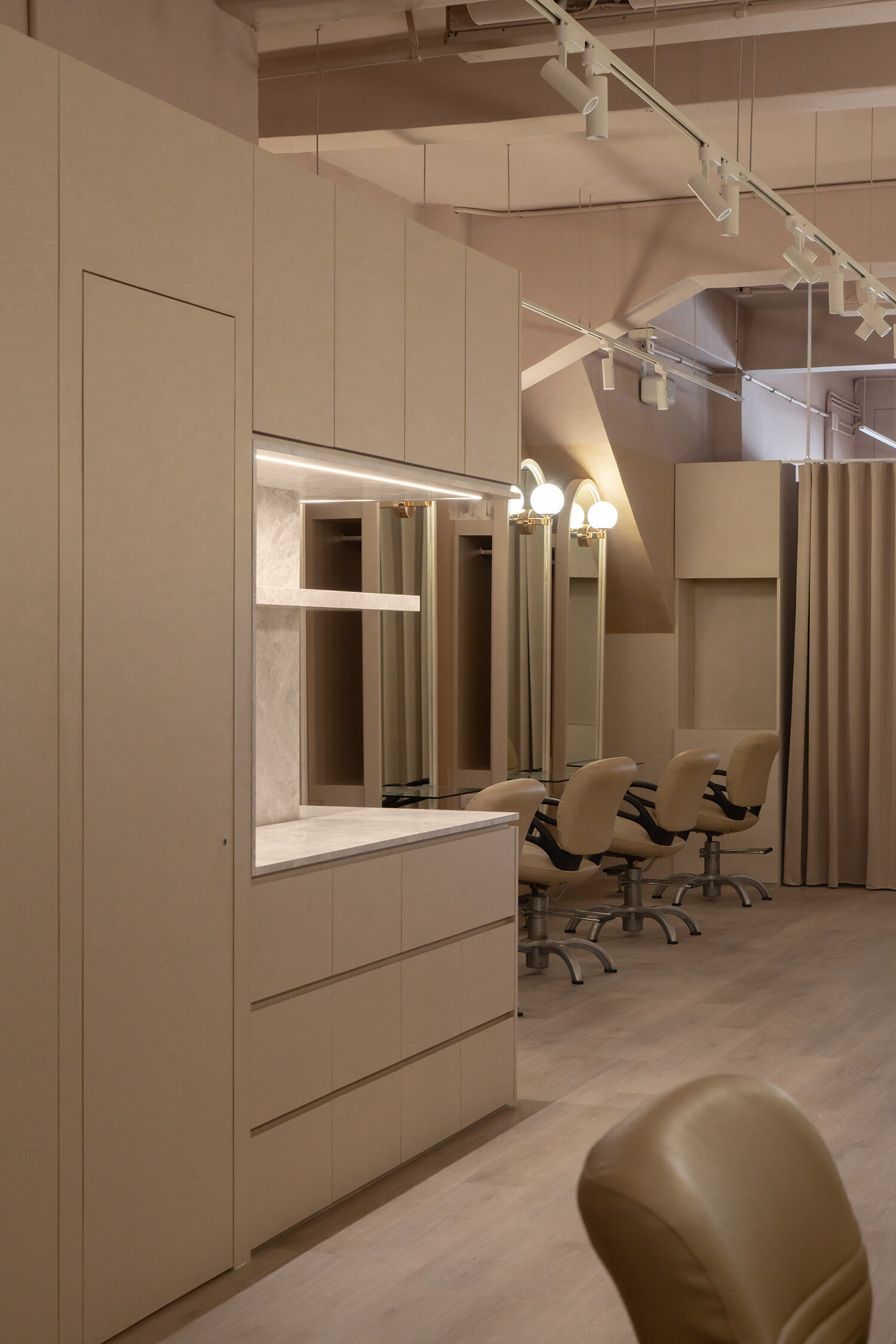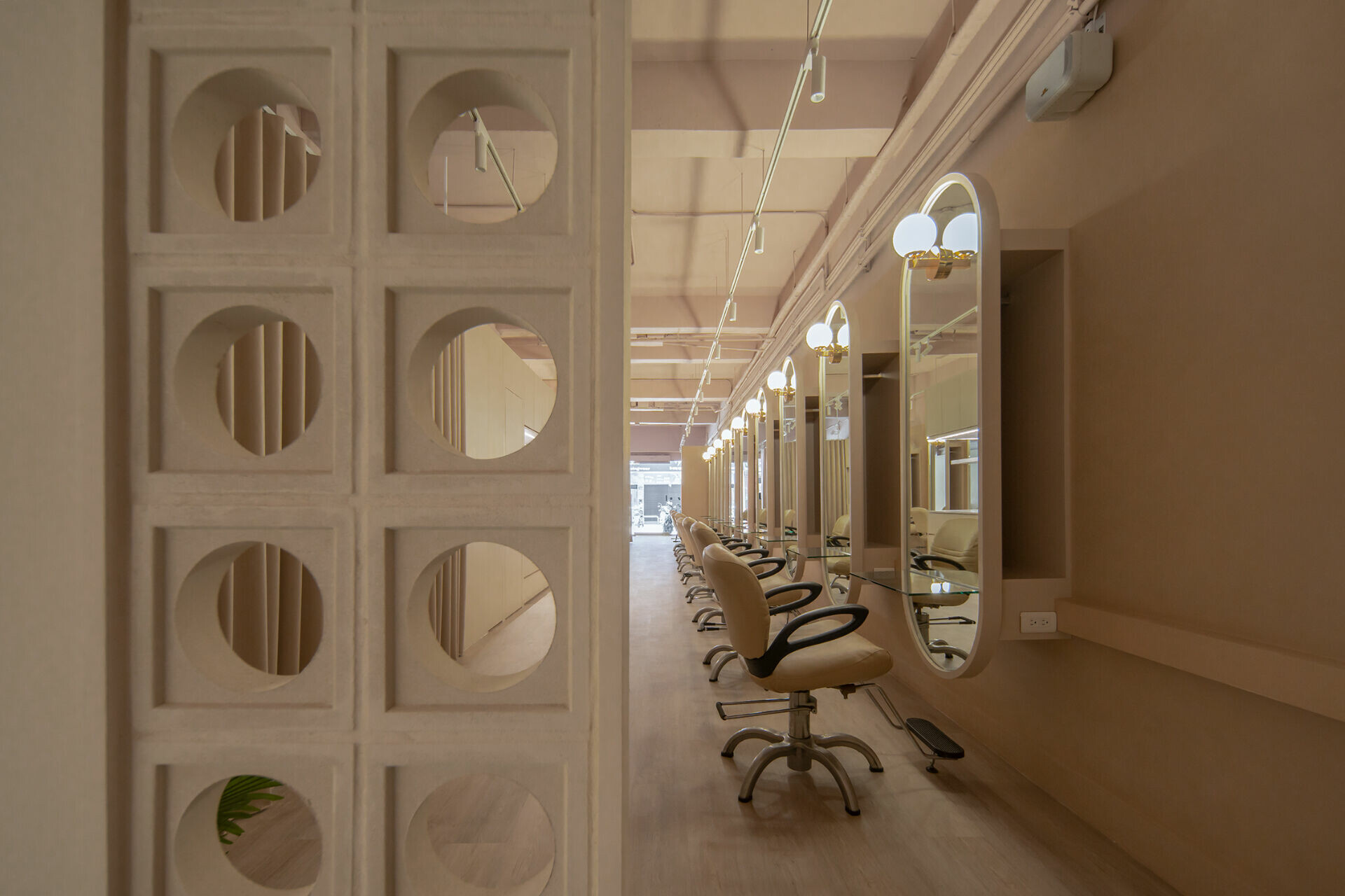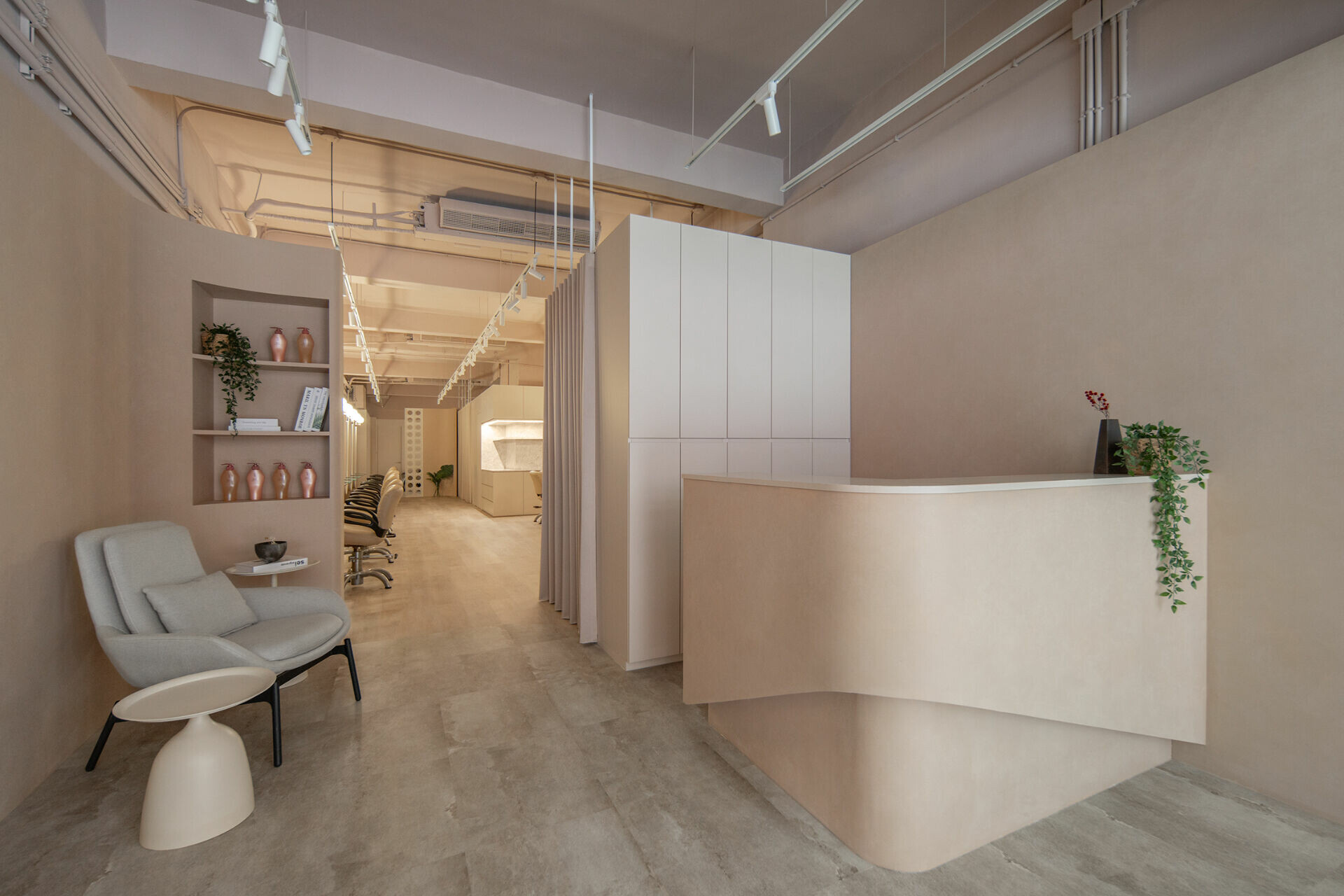以柔霧塗料與弧形線條,從接待區延伸至剪髮與洗髮空間,圓弧鏡面、倒角桌面、造型壁燈如光般流動、圍塑專屬的靜謐與節奏。