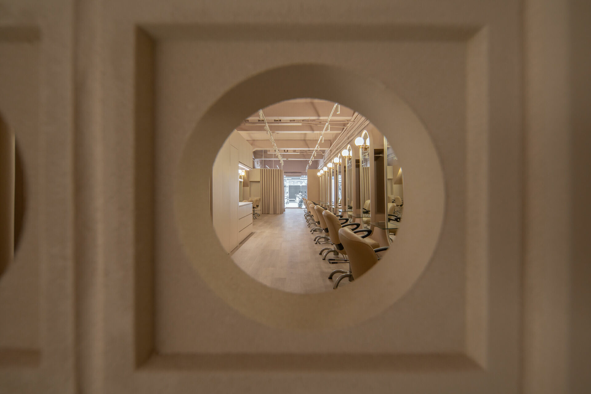 以柔霧塗料與弧形線條,從接待區延伸至剪髮與洗髮空間,圓弧鏡面、倒角桌面、造型壁燈如光般流動、圍塑專屬的靜謐與節奏。